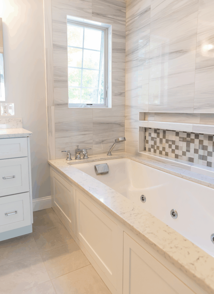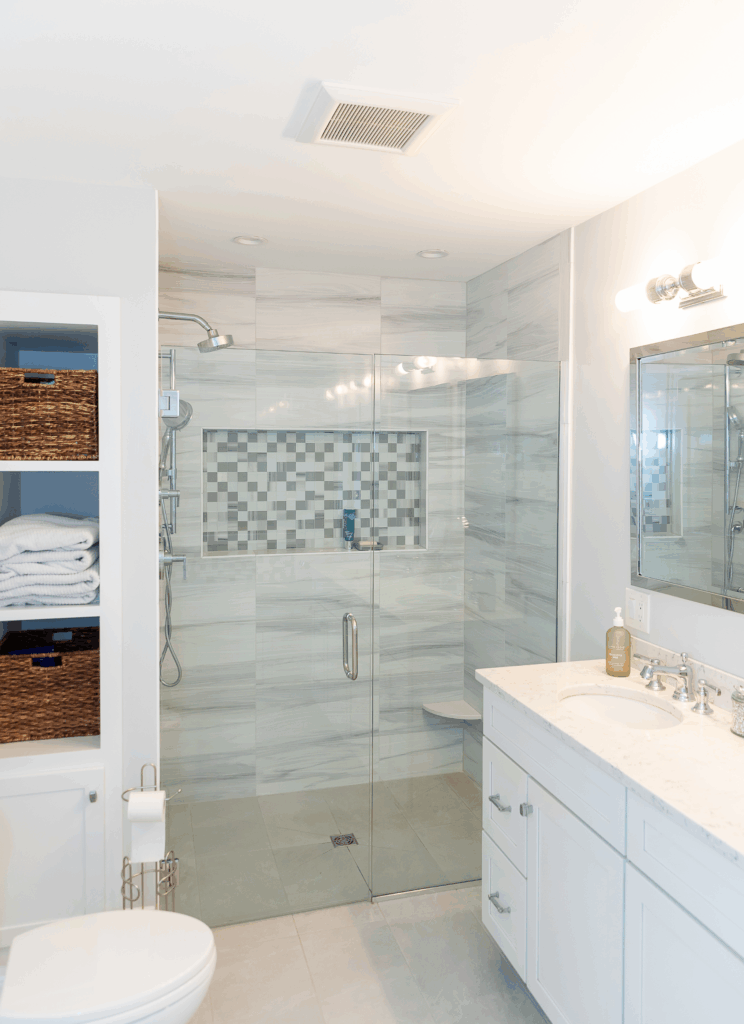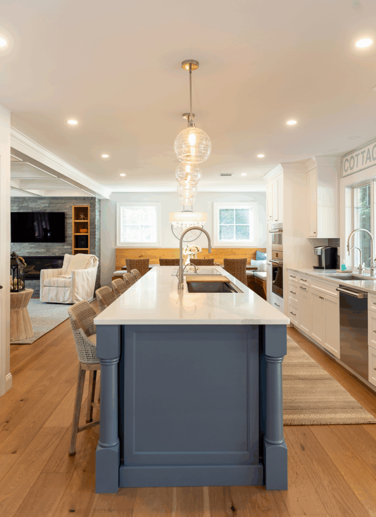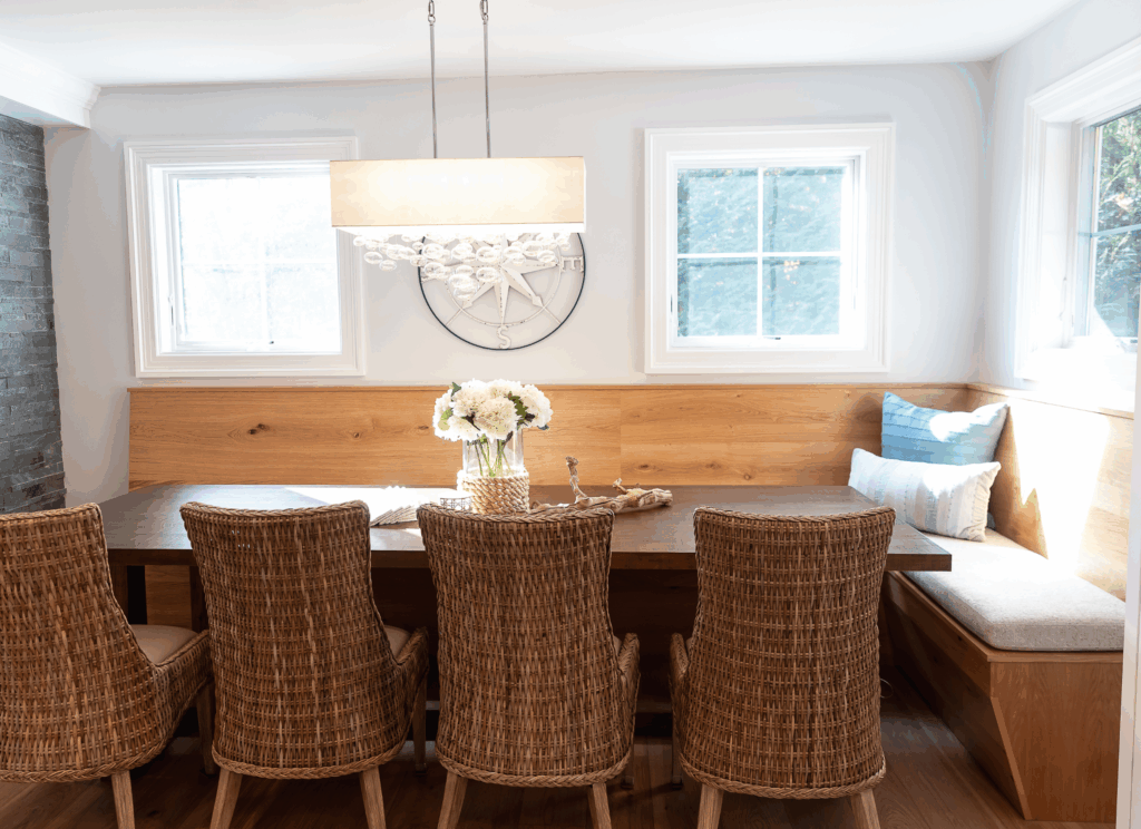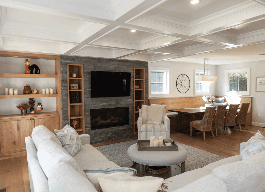Centered around comfort and connection, this remodel captures relaxed coastal living with a fresh, contemporary touch. The kitchen’s open layout and custom banquette create a breezy, welcoming hub for family gatherings, while white cabinetry and natural wood tones tie into the adjacent laundry and entry space for a seamless flow. A reimagined hearth anchors the living area with chestnut oak built-ins and a stacked stone fireplace, bringing texture and warmth throughout. In the primary bath, soft veined tile and built-in niches elevate everyday routines with quiet luxury. Designed for a family who loves to gather, every space in this home feels light, cohesive, and thoughtfully lived-in.