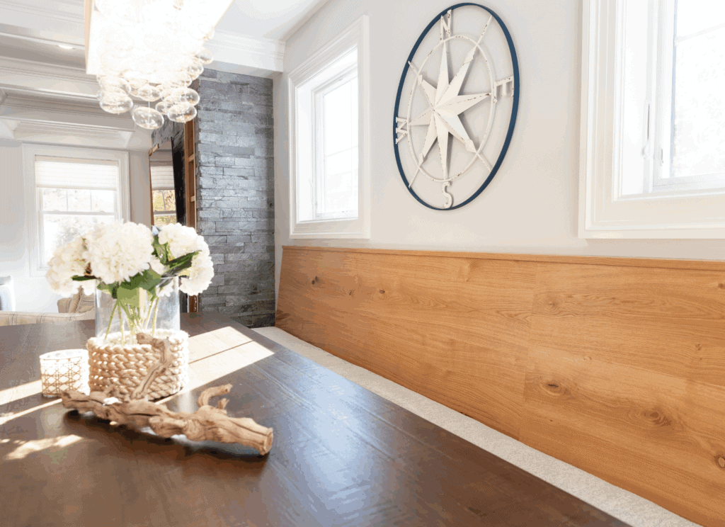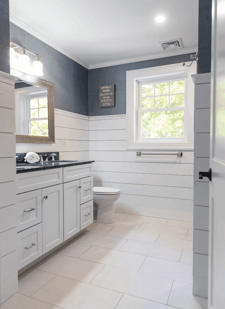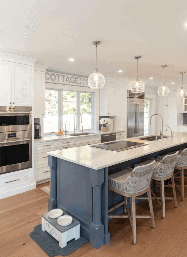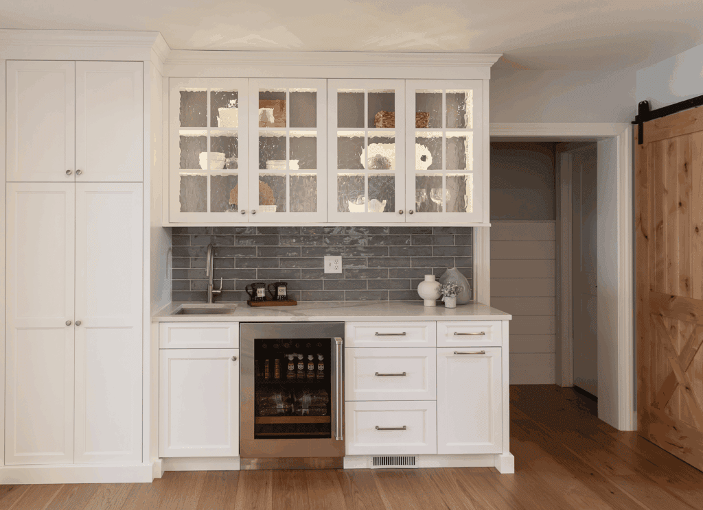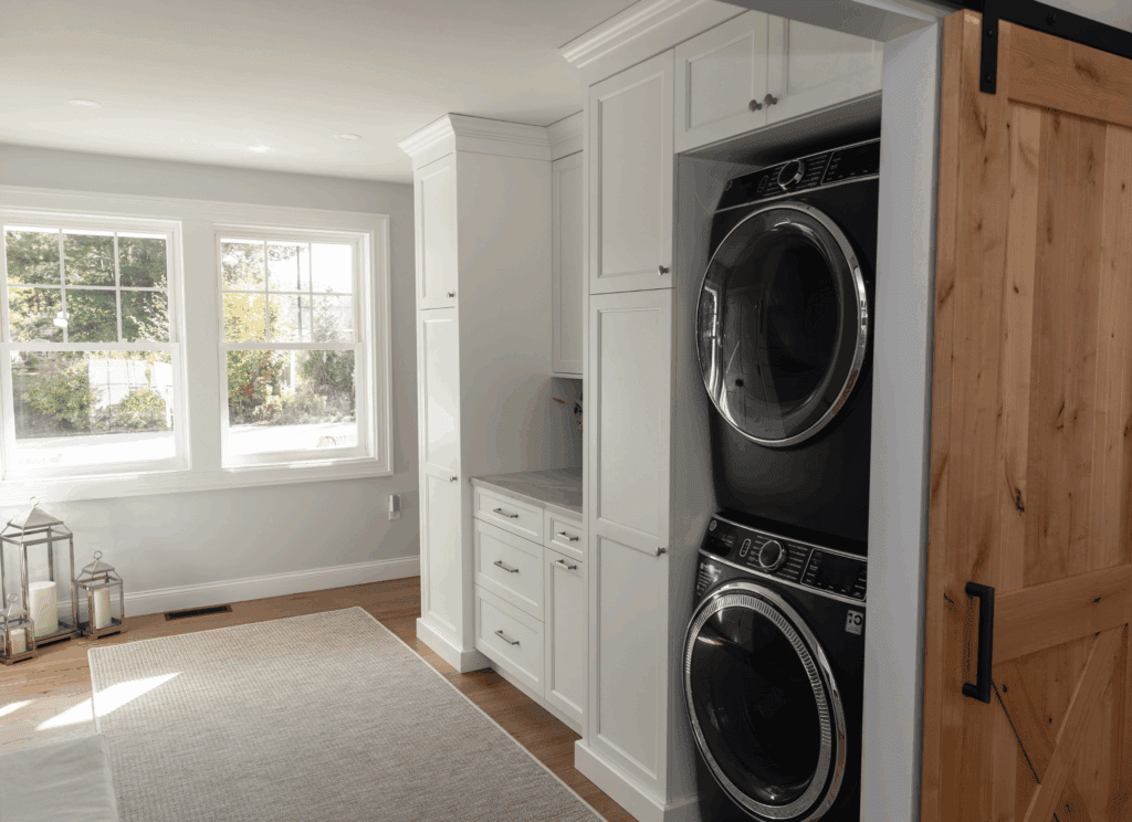 Centered around comfort and connection, this remodel captures relaxed coastal living with a fresh, contemporary touch. The kitchen’s open layout and custom banquette create a breezy, welcoming hub for family gatherings, while white cabinetry and natural wood tones tie into the adjacent laundry and entry space for a seamless flow. A reimagined hearth anchors the living area with chestnut oak built-ins and a stacked stone fireplace, bringing texture and warmth throughout. In the primary bath, soft veined tile and built-in niches elevate everyday routines with quiet luxury. Designed for a family who loves to gather, every space in this home feels light, cohesive, and thoughtfully lived-in.