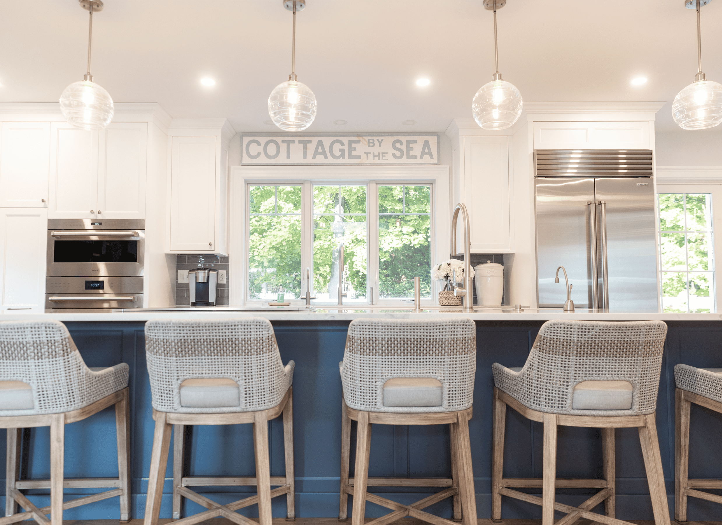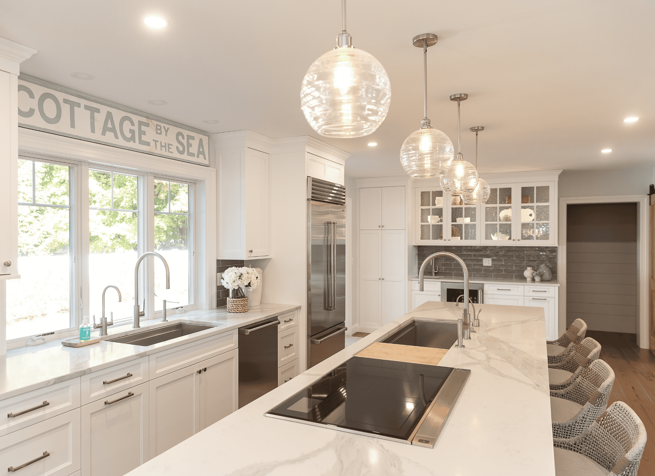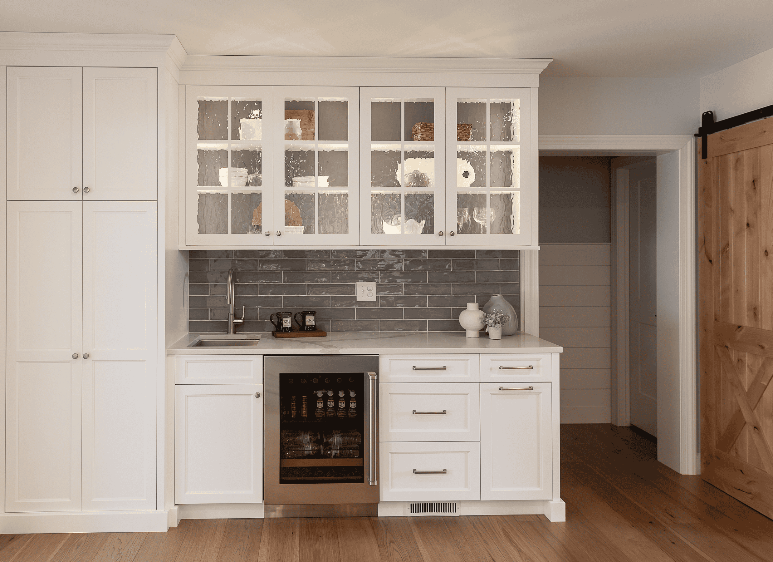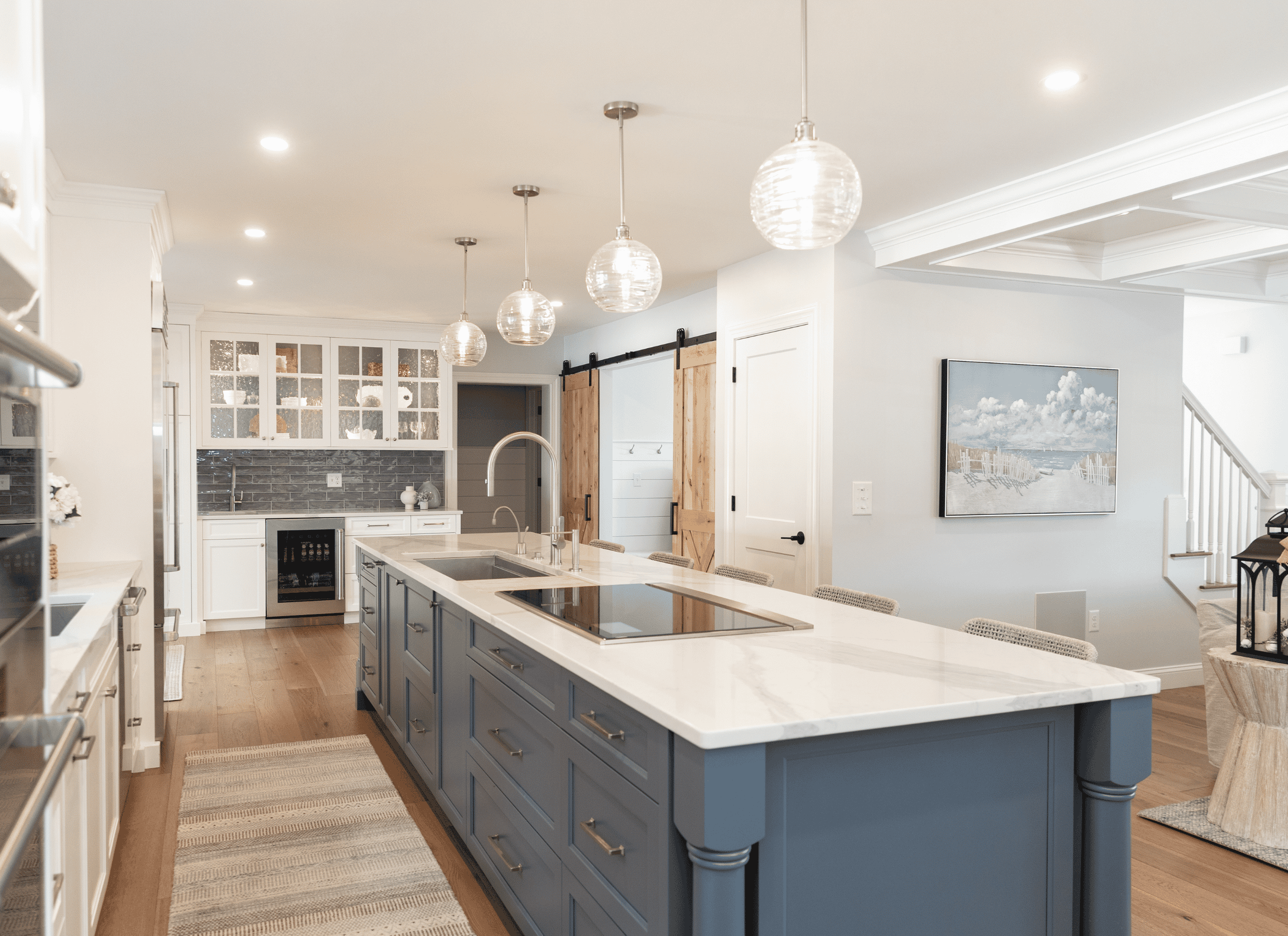 Centered around comfort and connection, this remodel captures relaxed coastal living with a fresh, contemporary touch. The kitchen’s open layout and custom banquette create a breezy, welcoming hub for family gatherings, while white cabinetry and natural wood tones tie into the adjacent laundry and entry space for a seamless flow. A reimagined hearth anchors the living area with chestnut oak built-ins and a stacked stone fireplace, bringing texture and warmth throughout. In the primary bath, soft veined tile and built-in niches elevate everyday routines with quiet luxury. Designed for a family who loves to gather, every space in this home feels light, cohesive, and thoughtfully lived-in.