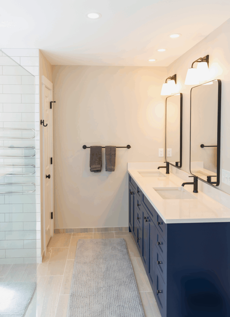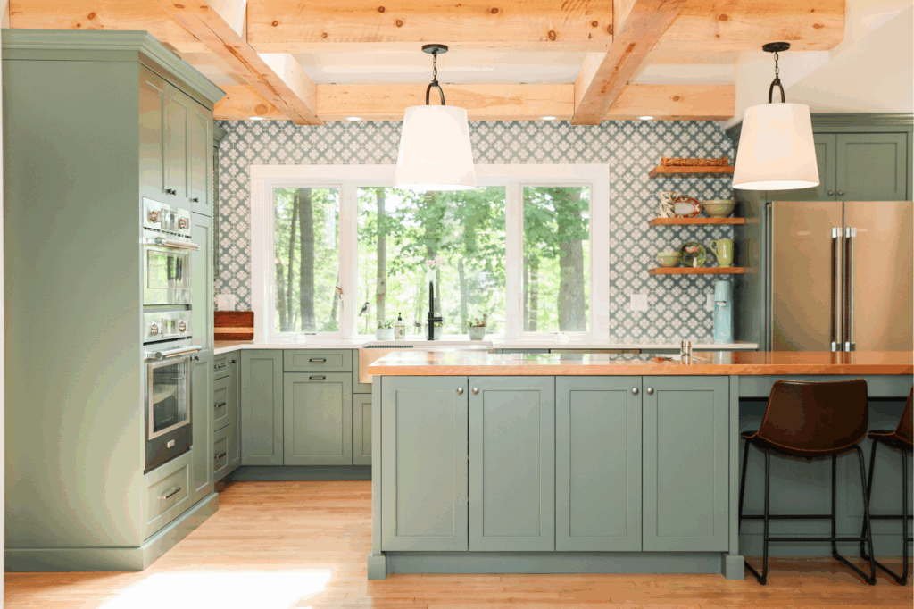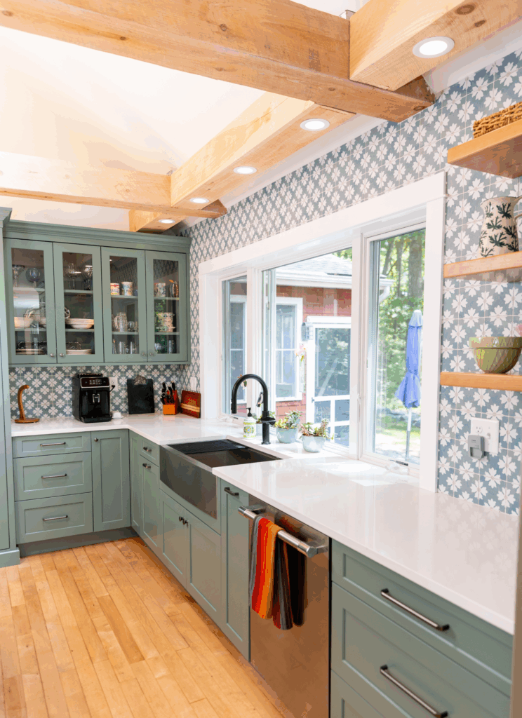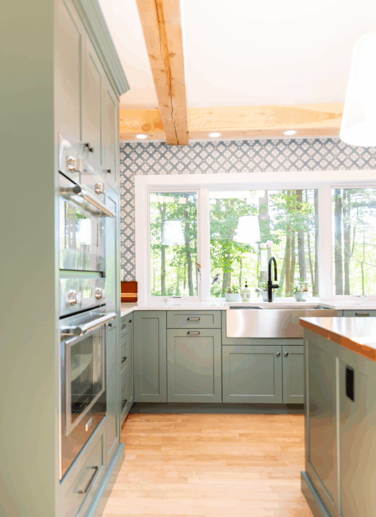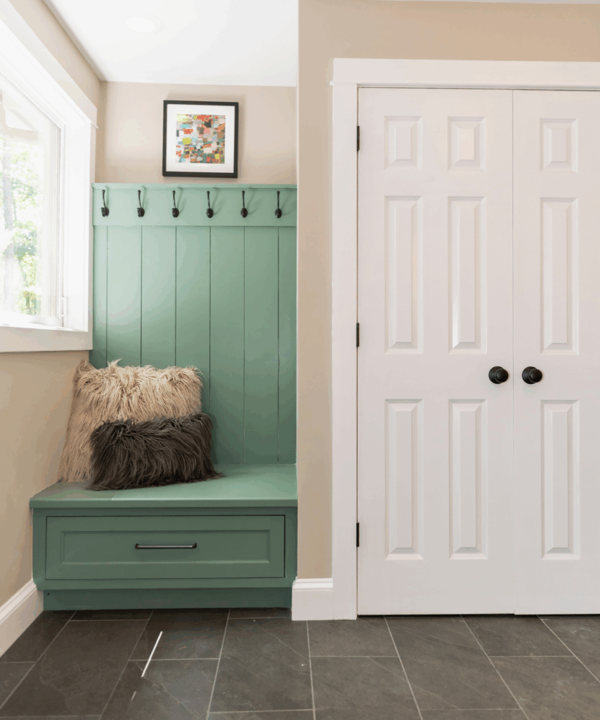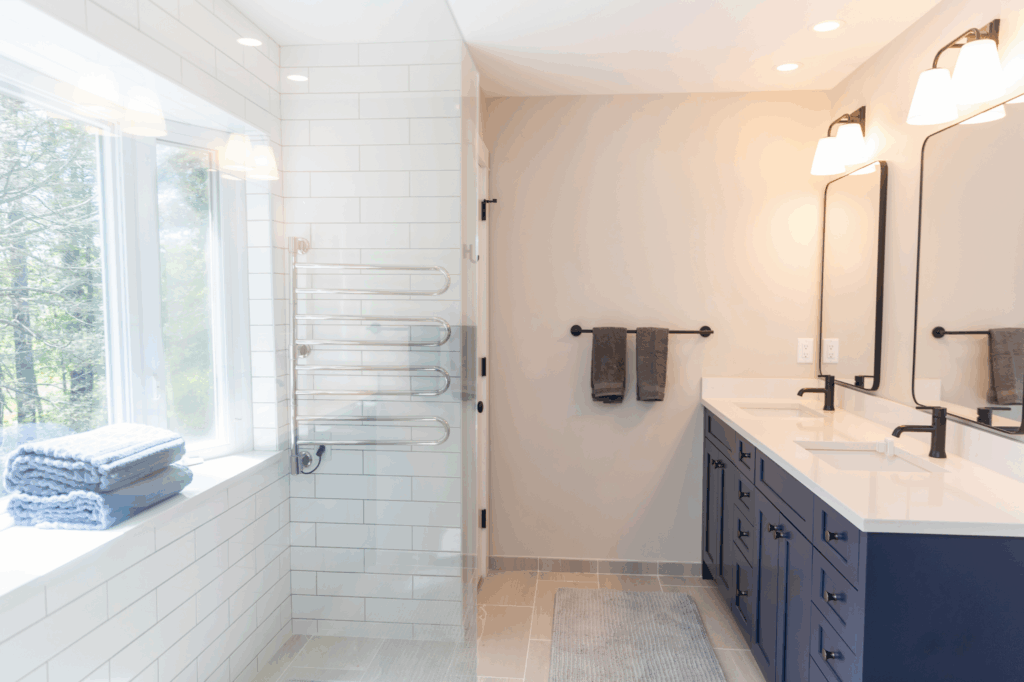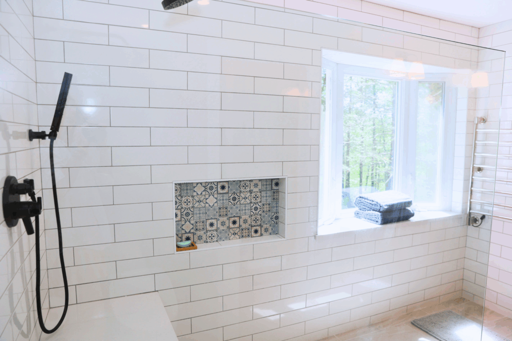 This home renovation blends natural tones, light-filled spaces, and thoughtful design across the kitchen, primary bath, and mudroom. A wood-topped island and dramatic floral tile bring warmth and visual interest to the kitchen, while the primary bath’s oversized frameless shower and integrated bay window create a luxurious retreat. The mudroom transforms underutilized space into a functional, welcoming entryway. Every detail was tailored to support the homeowner’s lifestyle and reflect the coastal charm of Rye, New Hampshire.
