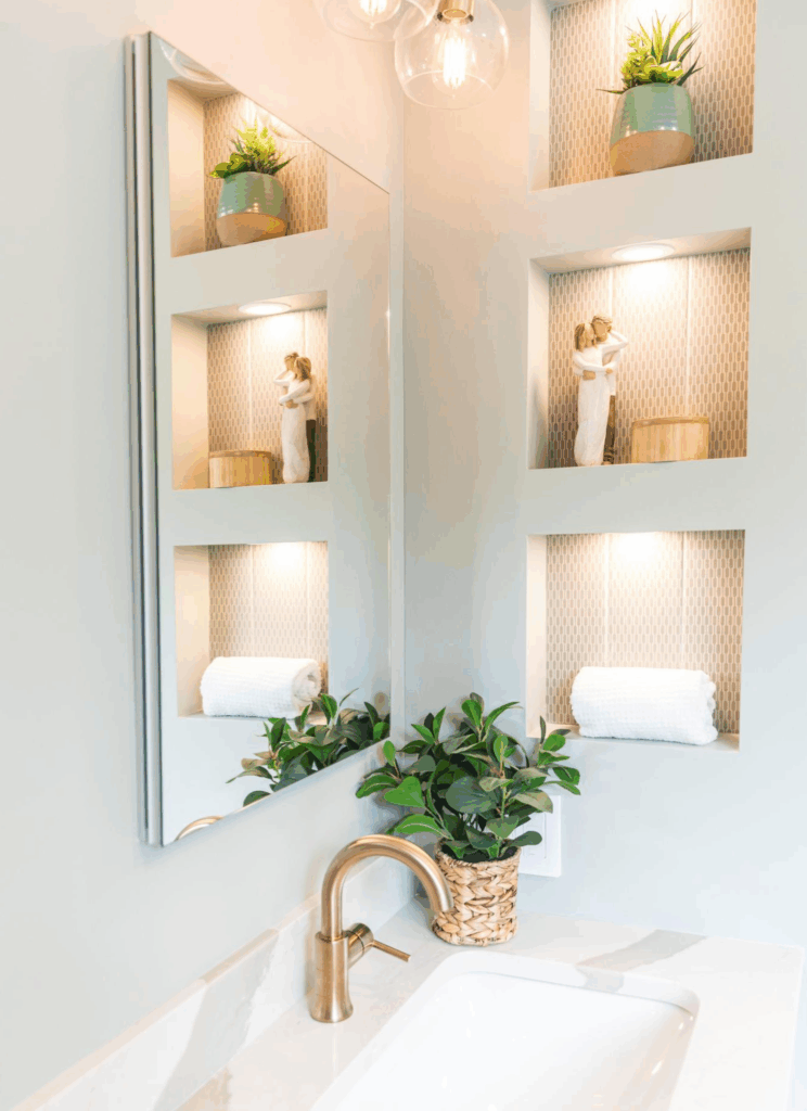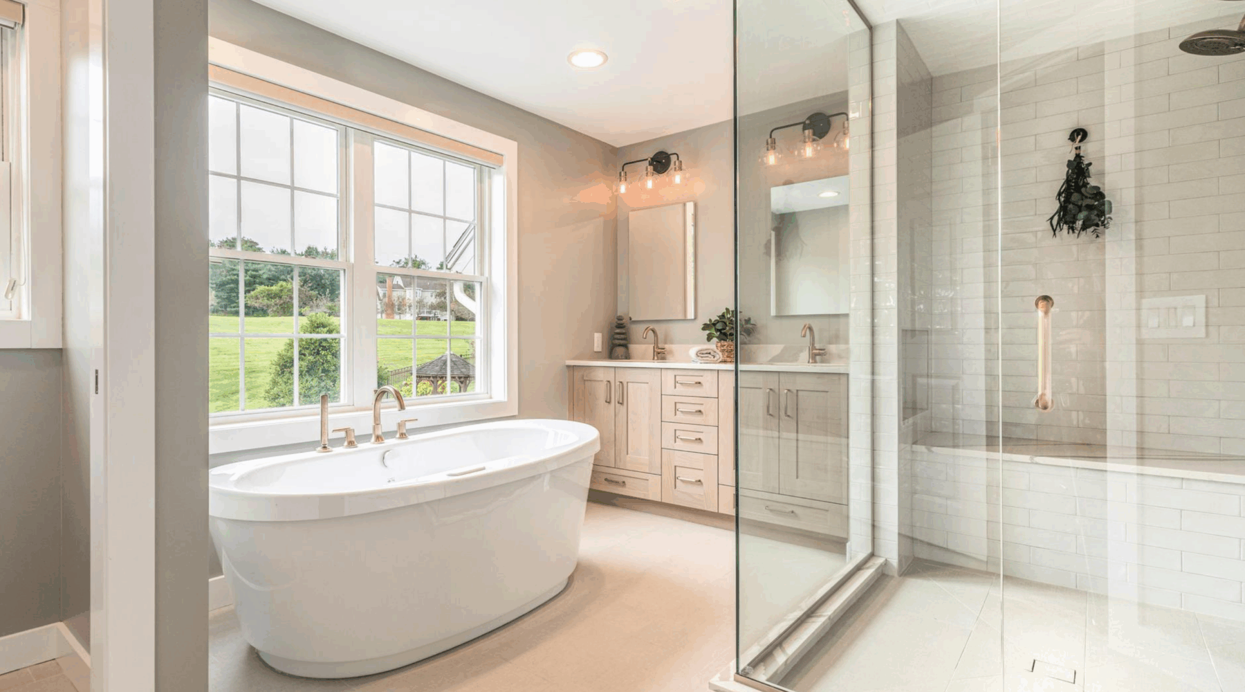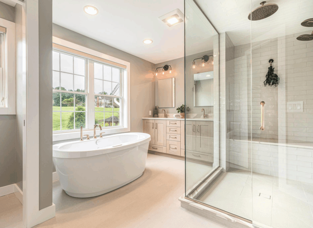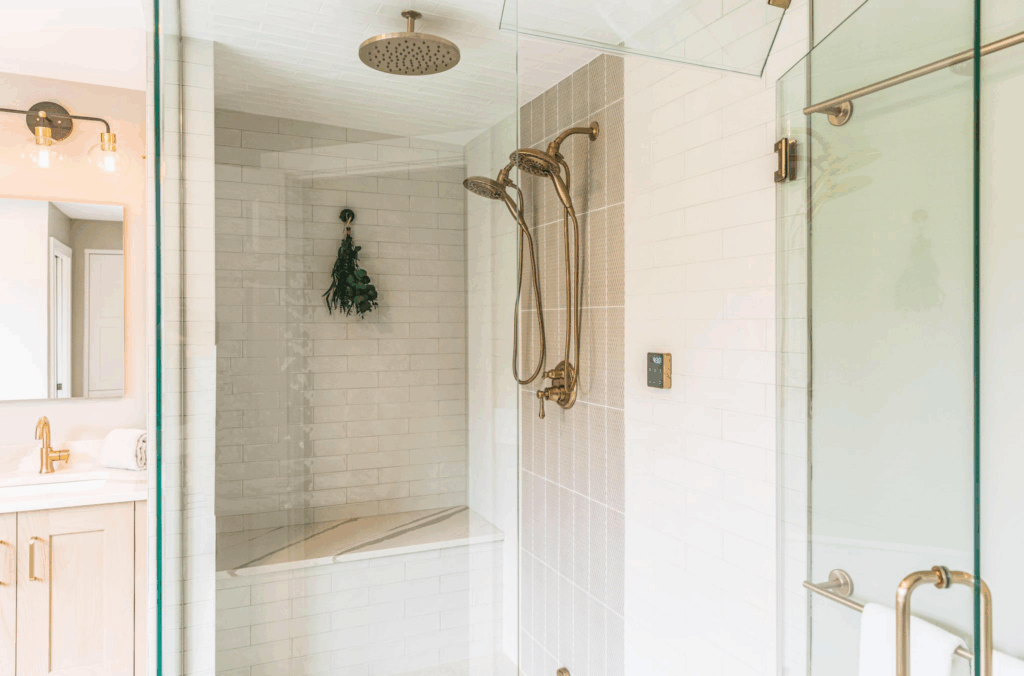 Natural materials and a luminous palette define this primary bath renovation. A glass-enclosed steam shower with layered subway and accent tiles anchors the space, while vertical illuminated niches provide functional elegance. The design maximizes light and space, resulting in a peaceful, hotel-inspired atmosphere where every detail encourages daily renewal.