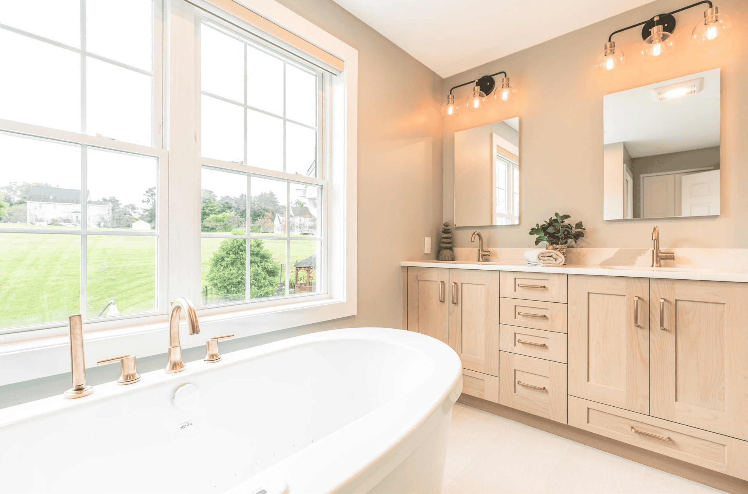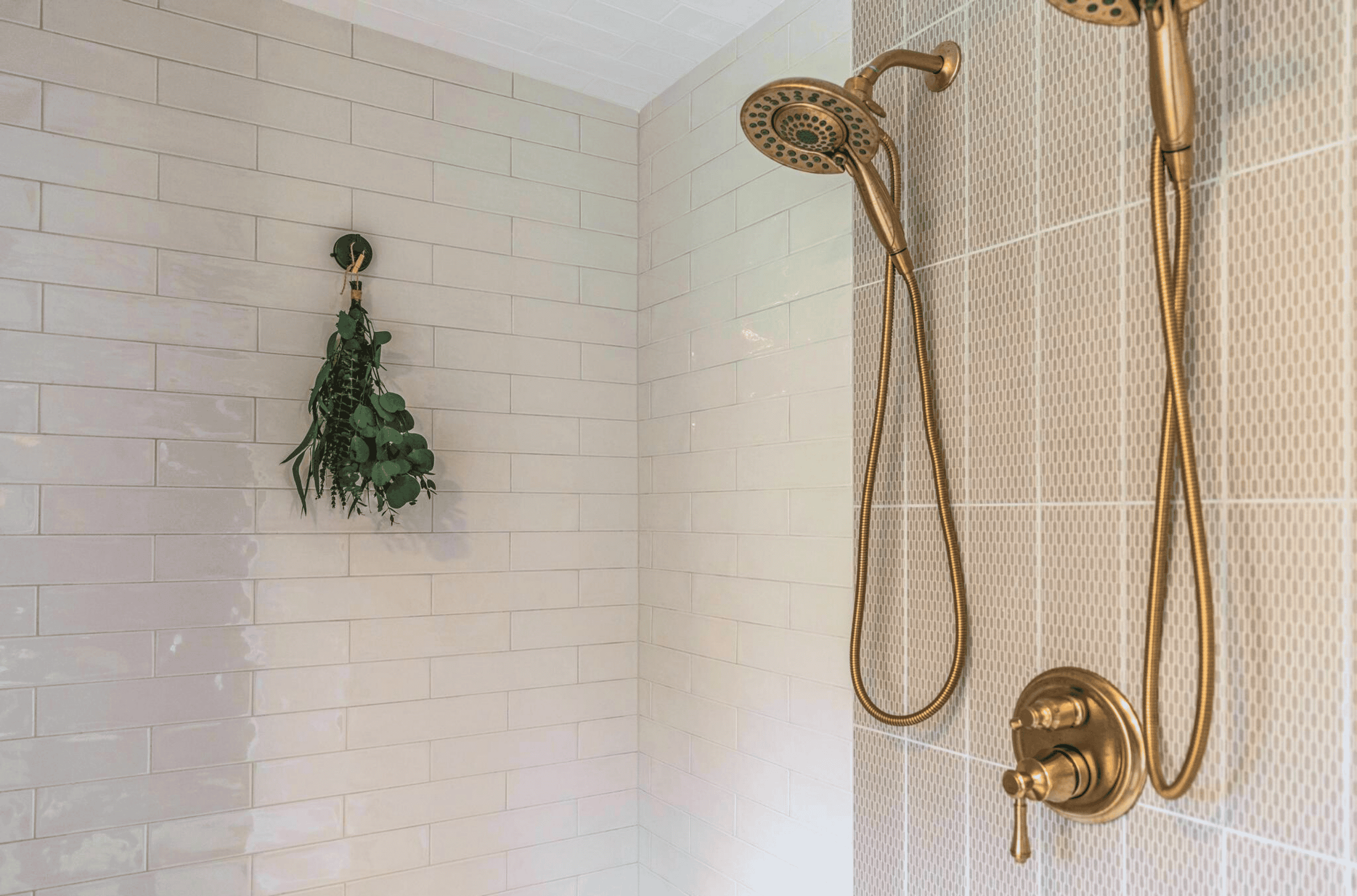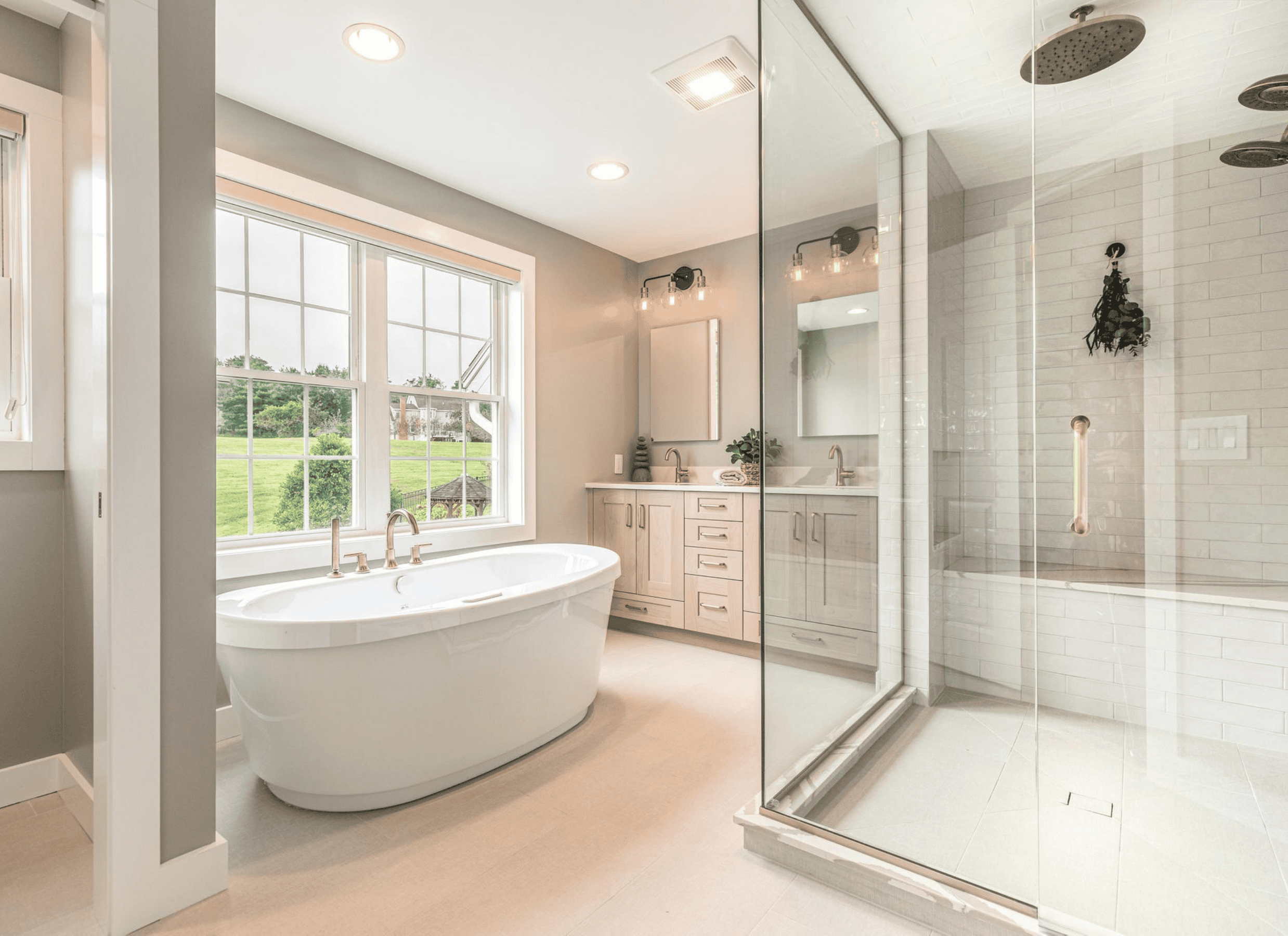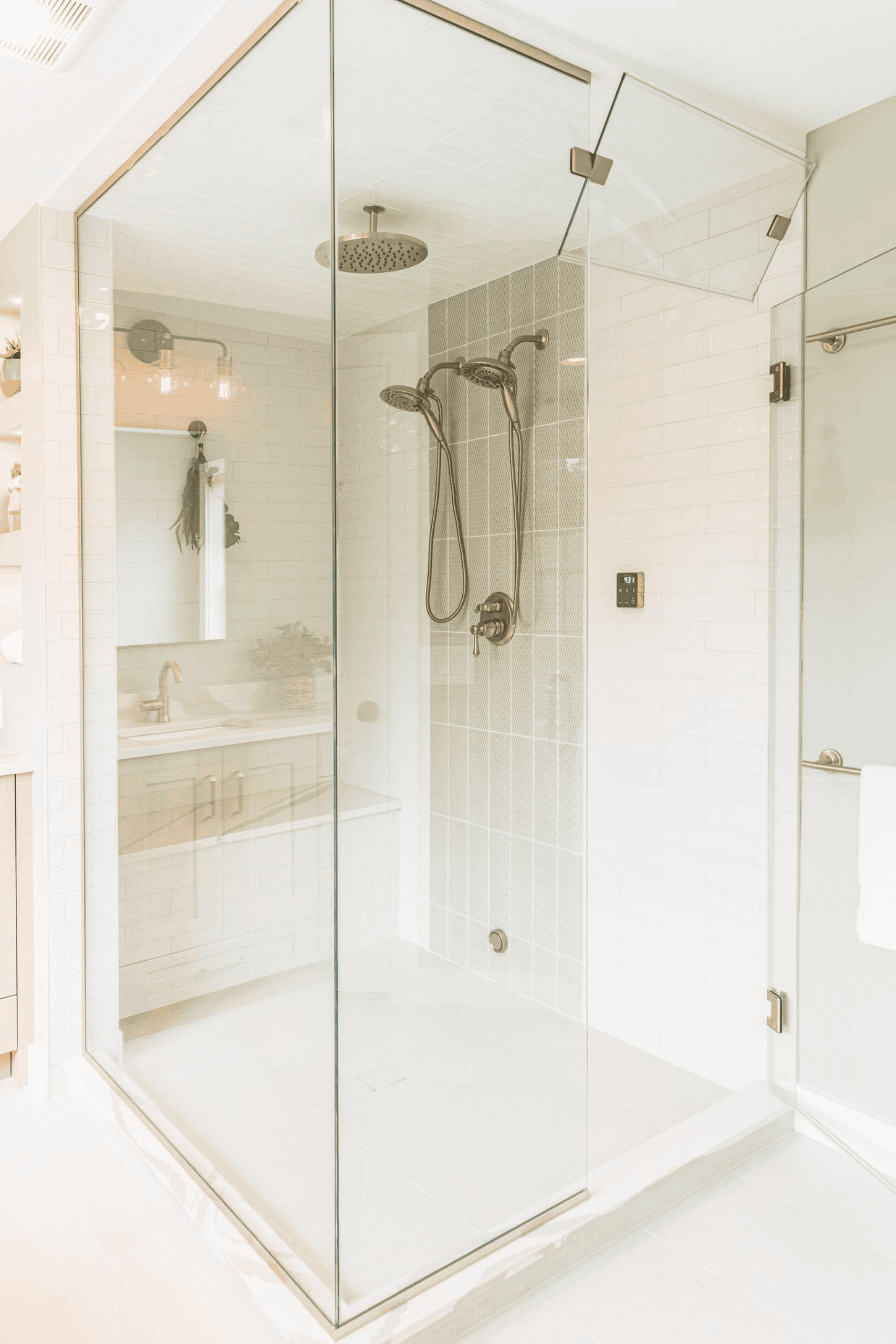 Natural materials and a luminous palette define this primary bath renovation. A glass-enclosed steam shower with layered subway and accent tiles anchors the space, while vertical illuminated niches provide functional elegance. The design maximizes light and space, resulting in a peaceful, hotel-inspired atmosphere where every detail encourages daily renewal.
