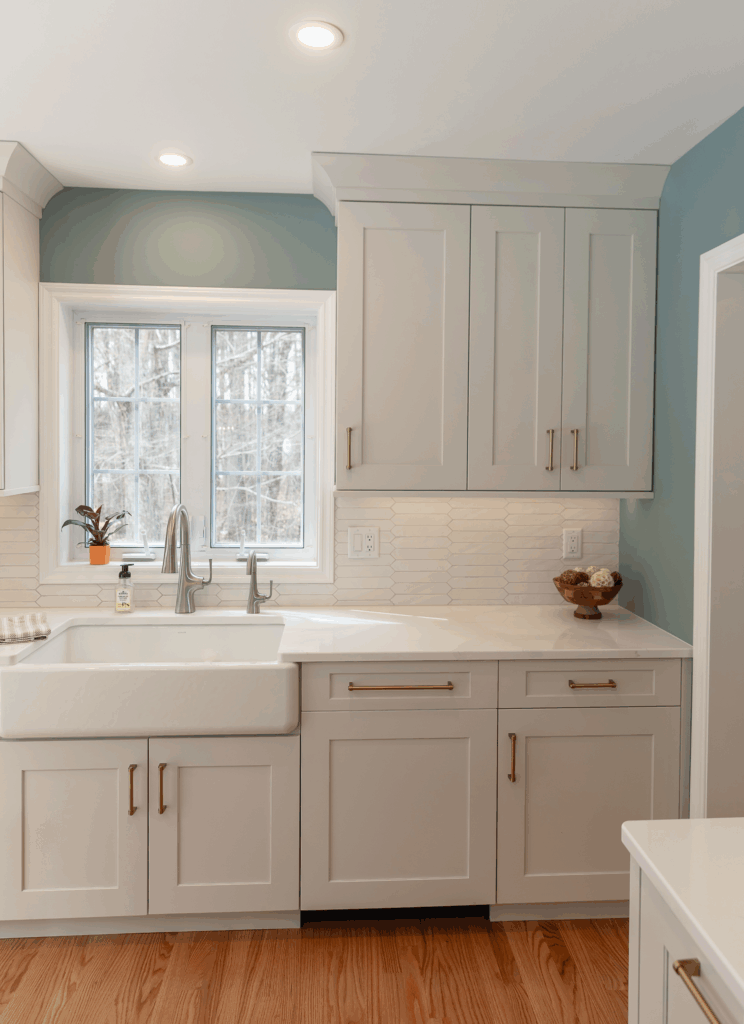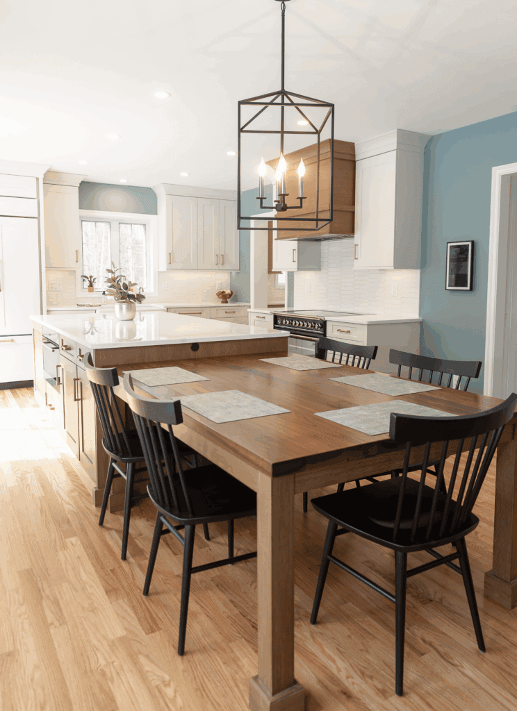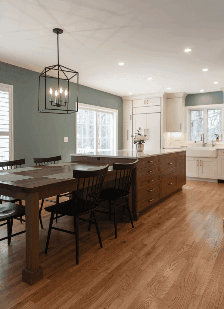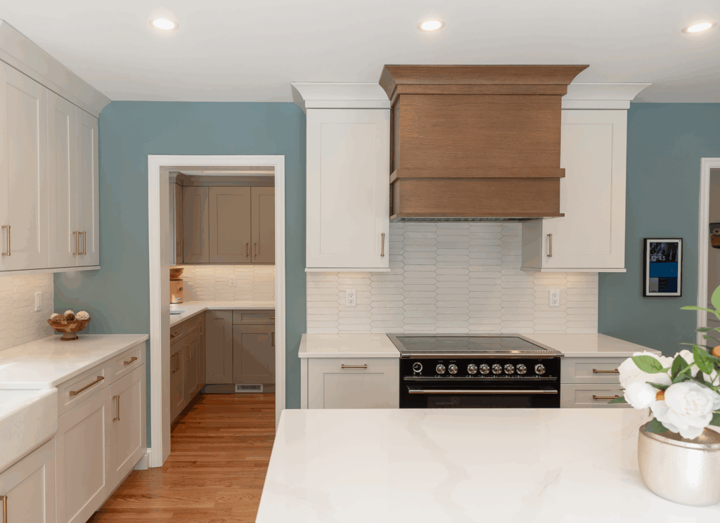 This kitchen and pantry renovation combines functionality with a welcoming, lived-in aesthetic. A walnut island anchors the space, flanked by mid-tone oak and off-white perimeter cabinetry, while panel-ready appliances maintain a clean, elegant look. Thoughtful zoning connects the main kitchen to the pantry, allowing for smooth workflow, and the warm neutral palette punctuated with subtle color creates a homey, yet sophisticated environment tailored for everyday family life.