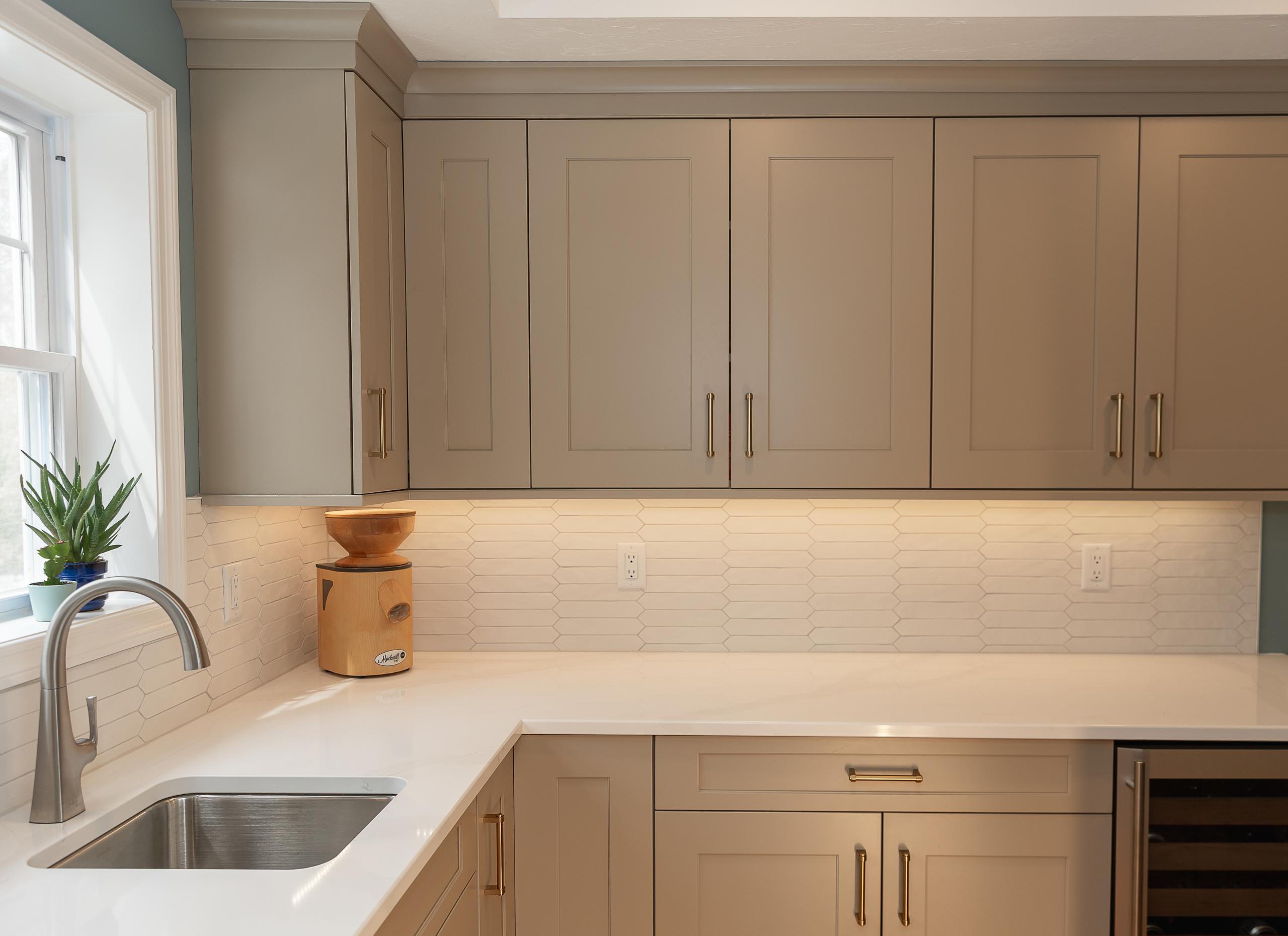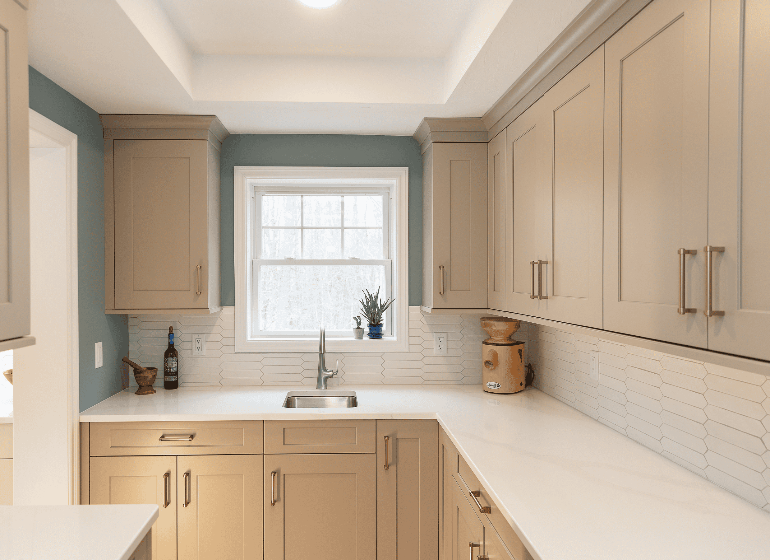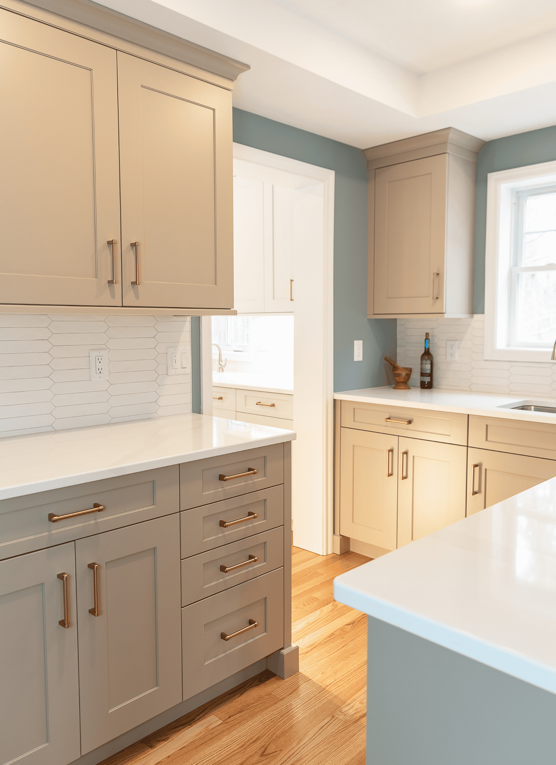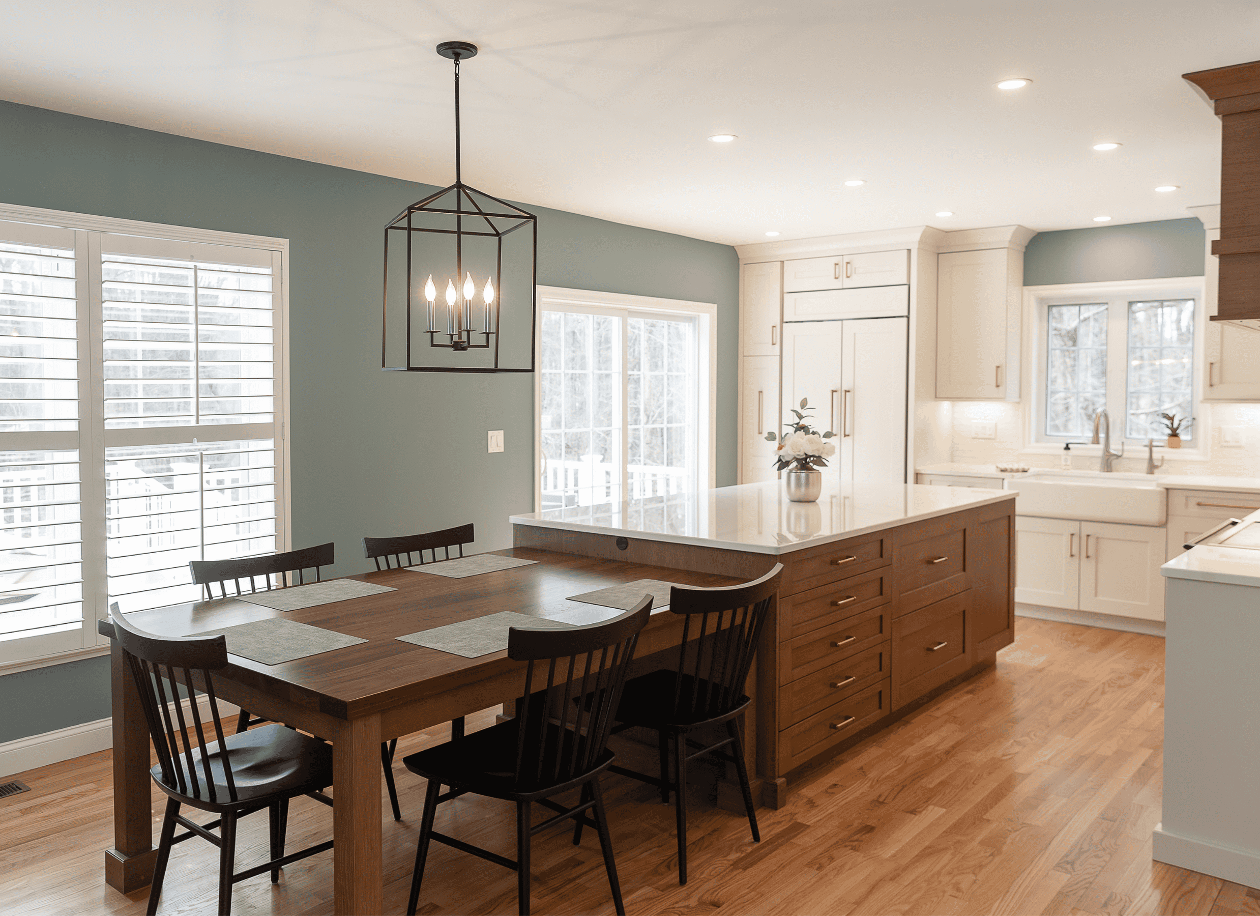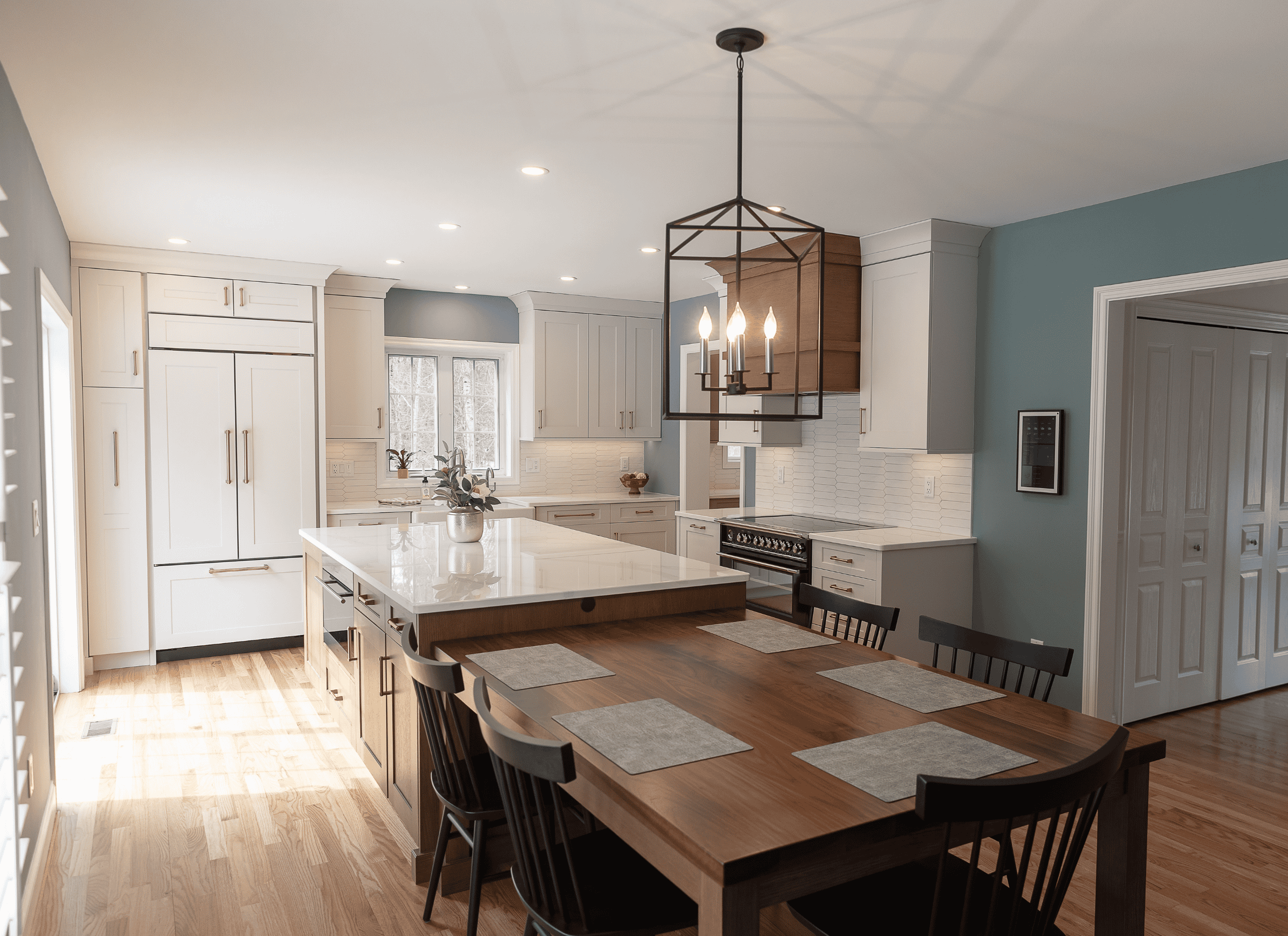 This kitchen and pantry renovation combines functionality with a welcoming, lived-in aesthetic. A walnut island anchors the space, flanked by mid-tone oak and off-white perimeter cabinetry, while panel-ready appliances maintain a clean, elegant look. Thoughtful zoning connects the main kitchen to the pantry, allowing for smooth workflow, and the warm neutral palette punctuated with subtle color creates a homey, yet sophisticated environment tailored for everyday family life.
