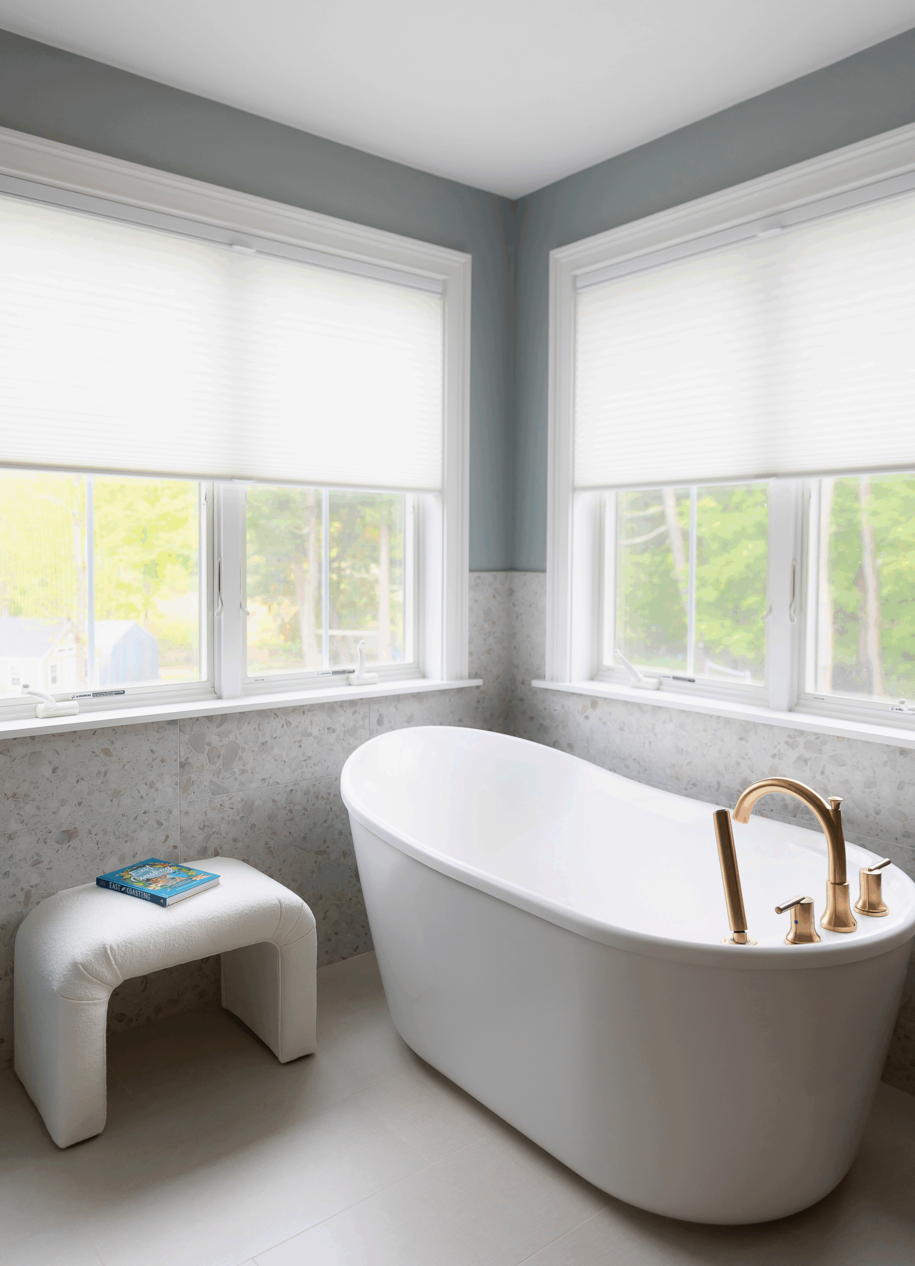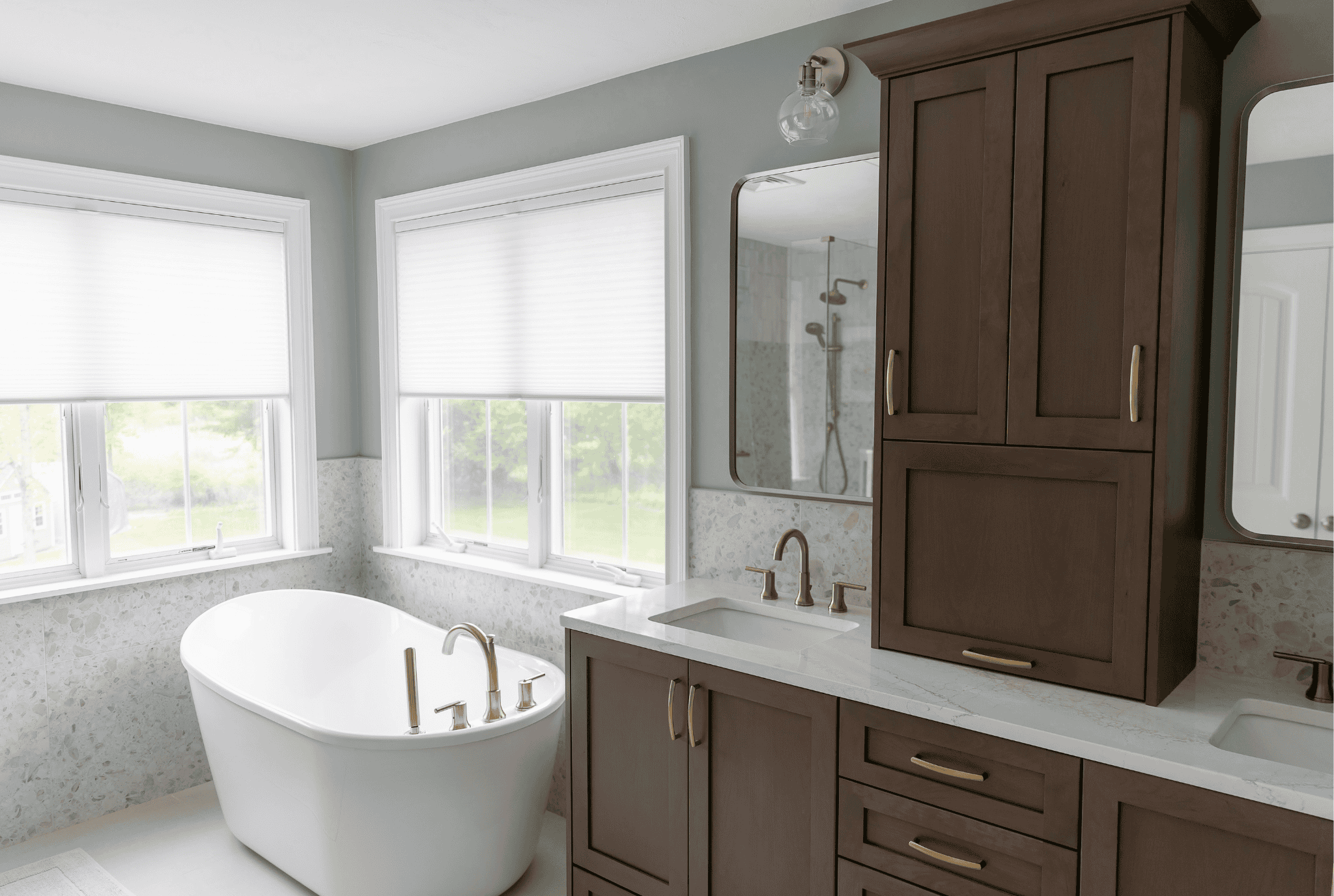 Warm tones and natural materials define this primary bath renovation. A WoodHarbor cherry vanity in cashmere finish anchors the space with rich depth, complemented by champagne bronze fixtures and hardware that echoes throughout. The walk-in shower layers texture and tone—white vertical subway tile meets speckled terrazzo tile, grounded by classic penny rounds underfoot. A teak bench and glass enclosure with brass hardware balance organic warmth with clarity. Thoughtful storage, including a center vanity tower, maintains the room’s uncluttered calm. Near the windows, a freestanding tub takes advantage of natural light throughout the day.