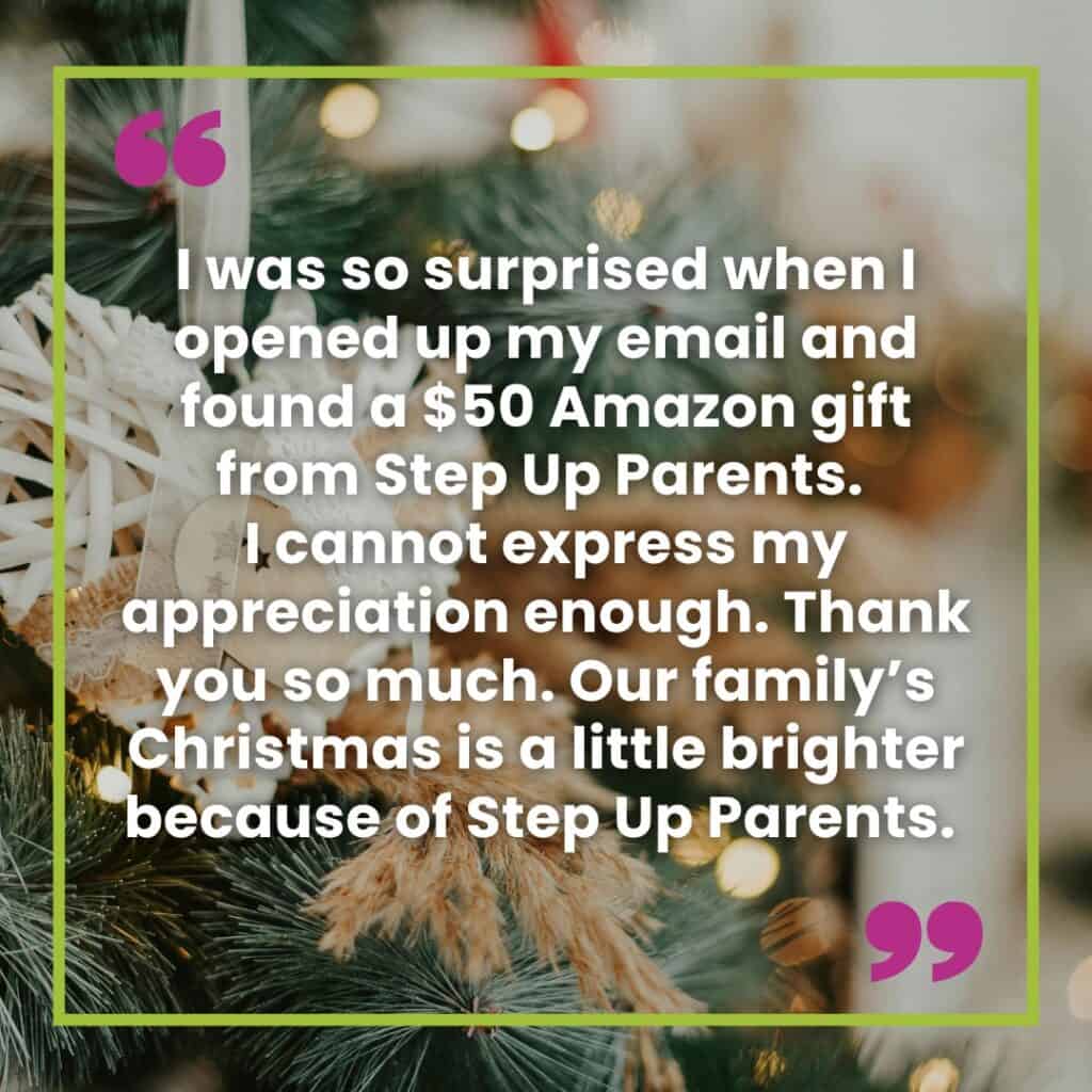 Financial support is only part of the equation. Kinship caregivers need to feel seen, valued, and less alone. Each December, Step Up Parents sends $50 Amazon gift cards to the families they have supported throughout the year. The responses from caregivers reveal how meaningful it is to be acknowledged during an especially stressful and expensive time of year. One thank-you note captured it perfectly: the relief, the gratitude, and the simple comfort of knowing someone sees the work you are doing.